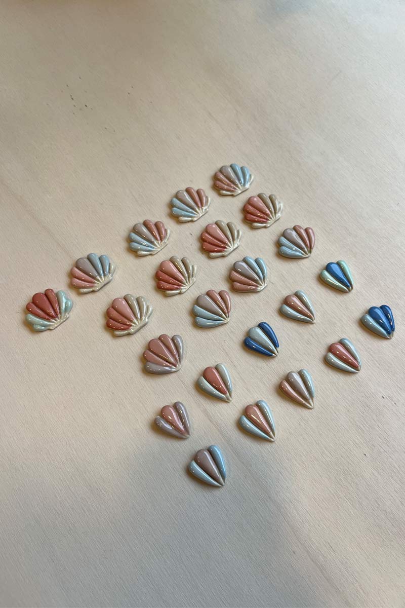 Fèves coquillages édition 2024 réalisées pour la boulangerie Pain Grillé à Vannes transformées en broches. Pièces réalisées en grès blanc engobées de plusieurs couleurs au pinceau et émaillées de couverte brillante.